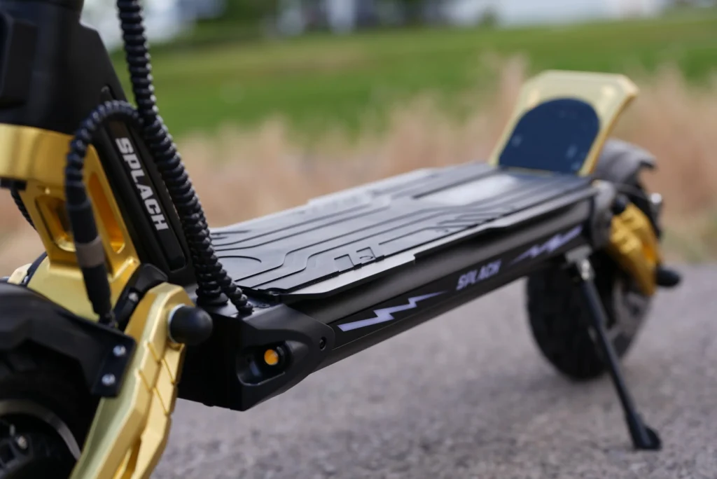 Aesthetics and Frame: The Blazing Gold finish turns heads everywhere I go. The paint job is bold and high-quality, giving the scooter a premium look. The frame itself feels solid and well-constructed, it’s a sturdily-built aluminum body with a sleek, flat deck design. Despite the flashy color, the build is all about function: nothing rattles or feels flimsy even when riding fast on bumpy roads. The scooter has a high ground clearance of about 6 inches, which I noticed helps a lot when navigating rough city streets or hopping over curbs. The deck is roomy enough for my feet, and there’s even a small rear kickplate for bracing when accelerating hard.