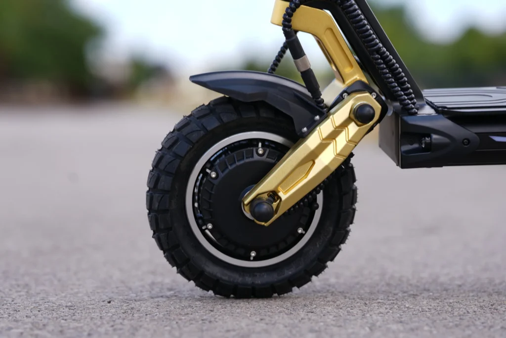 Given the Thunder 10’s speed, ride comfort was crucial for me, and I’m happy to report it delivers a surprisingly smooth ride for a scooter of this size. The scooter features dual suspension: front and rear rubber cartridge shocks instead of traditional spring/coil shocks. I was initially skeptical of rubber suspension, it’s a design usually seen on expensive Dualtron scooters, known to be stiff at first, but it turned out to be one of my favorite things about this scooter. The rubber shocks have a non-linear feel, they are soft on small bumps but firm up on big hits, effectively “self-adjusting” to the rider’s weight and the terrain. As a result, the Thunder 10 glides over cracked pavement, manhole covers, and typical city street bumps with ease. The ride is not pillow-soft, you still feel the road feedback, but it takes the harsh edge off jolts. Over time, I’ve noticed the suspension breaking in and getting even plusher; rubber tends to soften slightly with use, so the scooter’s ride has improved as the miles accumulate. On my daily commute, which includes some brick pathways and a few sections of rough asphalt, the Thunder stays composed and doesn’t rattle my joints. I arrive at work without numb hands or shaky knees, which I can’t say for my old solid-tire scooter.
